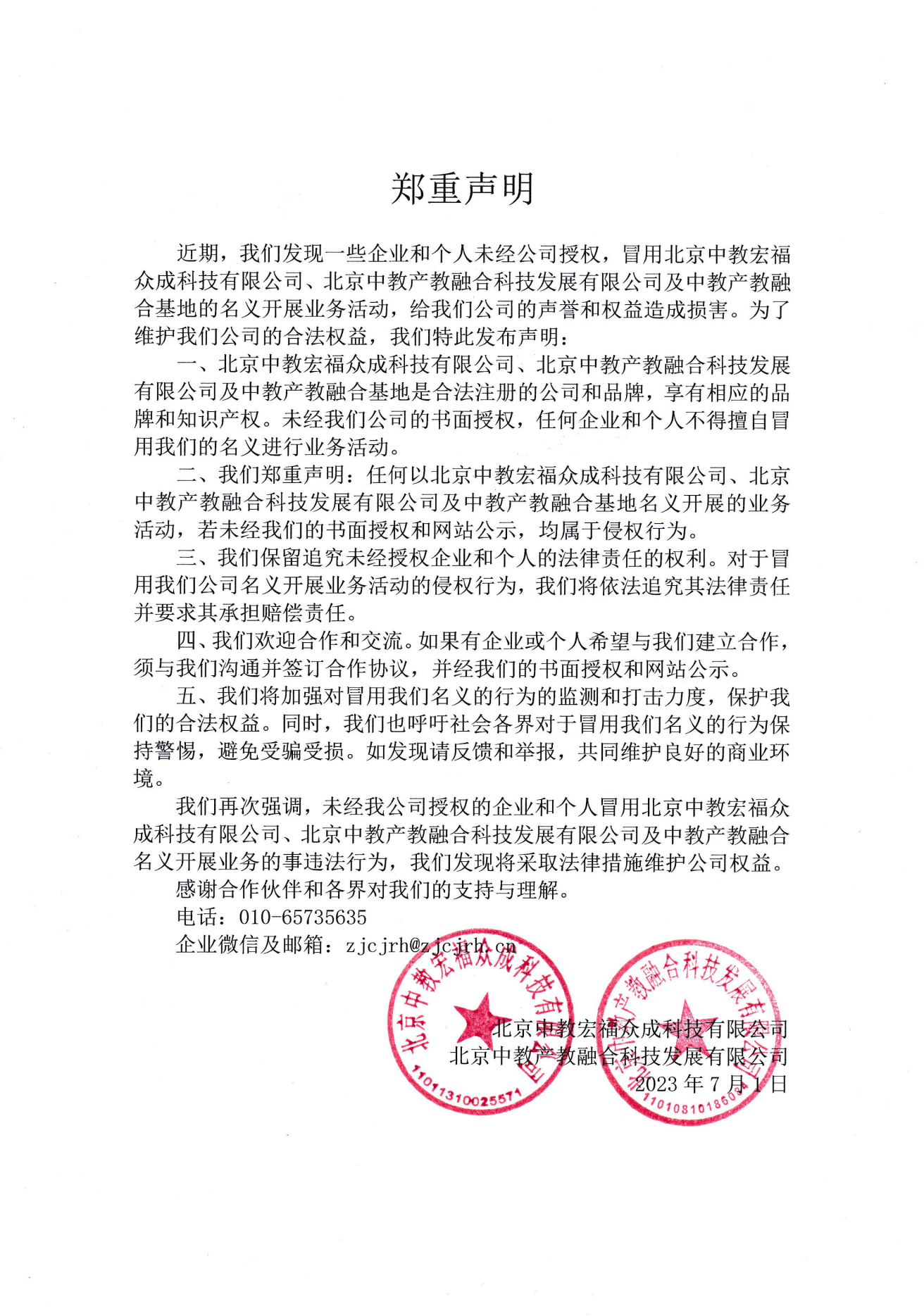中教宏福、中教产教融合 郑重声明
